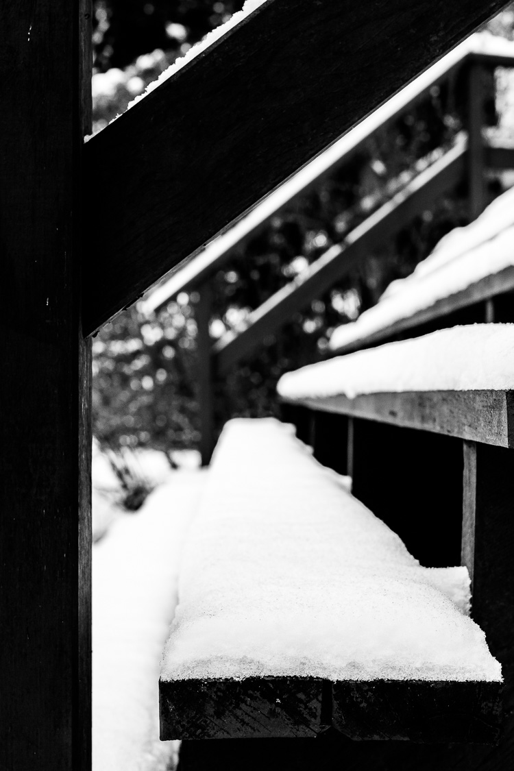 Schwierigkeiten beim Erkennen? Das soll ja bei Fotos nicht unbedingt sein, andererseits ist es auch die Aufgabe der Fotografie, neue Blickwinkel auf Bekanntes zu finden. Wir sehen hier die verschneiten Stufen unserer Terrasse, aber noch wichtiger als das Motiv war mir der Bildausschnitt mit den verschiedenen Parallelen im Bild.
