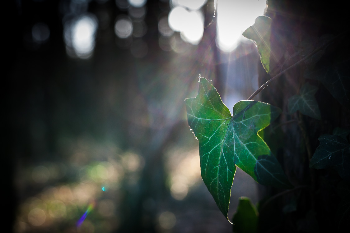 Bei diesem Efeublatt hilft es natürlich, dass es ein bisschen Licht hindurchlässt, weshalb die Vorderseite eben nicht ganz dunkel geworden ist. Und natürlich ist auch die Bildbearbeitung wieder zum Einsatz gekommen: Weniger Lichter in der Sonne, mehr Licht, Kontrast und Sättigung auf dem Blatt, eine leichte Vignette in den Ecken.