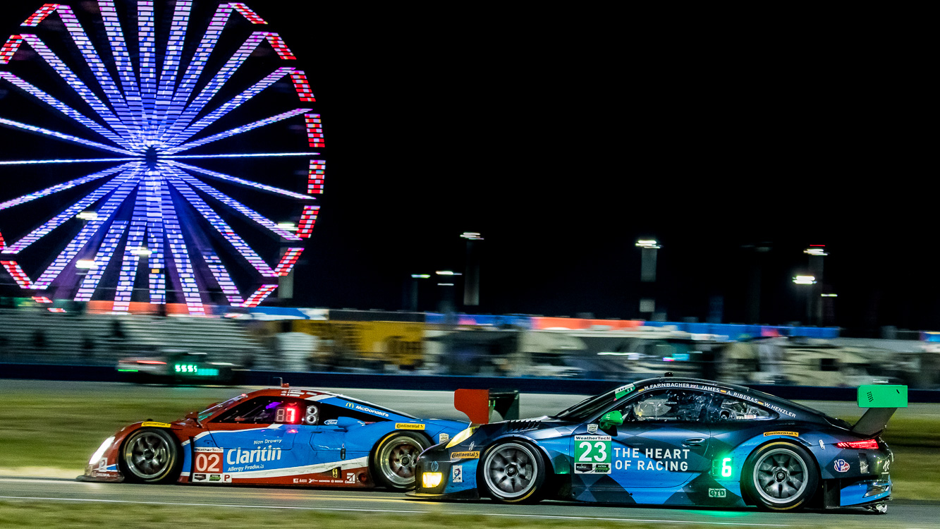 Wenn ich das Foto von heute mit meinem absoluten Lieblingsmitzieher vom 24-Stunden-Rennen in Daytona vergleiche, das ich hier mal zum Vergleich einstelle (Blogpost dazu am 31.1.2016), dann unterscheidet sich da nur die Lichtempfindlichkeit des Sensors geringfügig, in Daytona war ich bei ansonsten gleichen Bilddaten auf ISO 1250. Das ist nicht mal eine Blendenstufe zusätzlich (die wäre bei ISO 1600 erreicht gewesen). Dabei ist die Strecke in Daytona längst nicht so stark beleuchtet wie die in Bahrain.