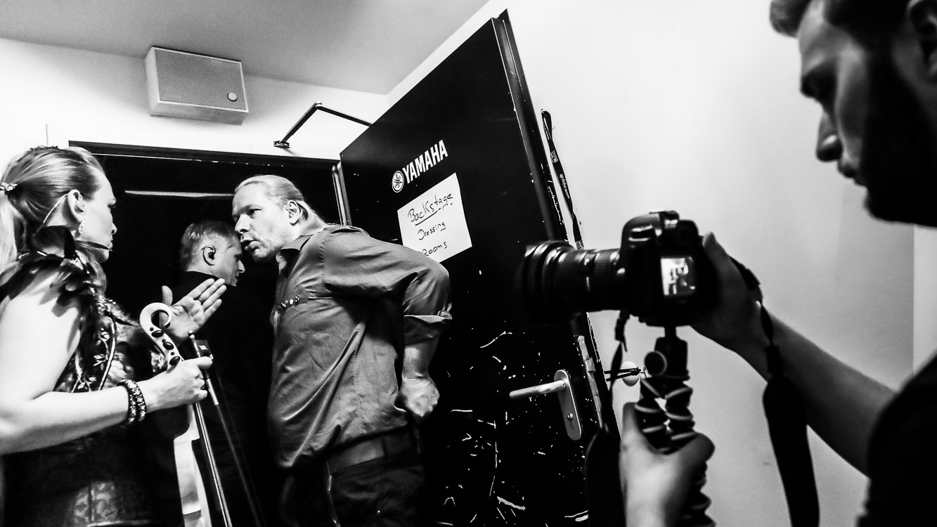 Ich dagegen musste auf Tim nicht so achten, den ich hatte mich ja für die Tournee und auch für das ganze Jahr, in dem ich Subway to Sally immer wieder begleite (wer es noch nicht weiß: für einen Bildband), der Reportagefotografie verschrieben. Das bedeutet: Ich inszeniere nichts, sondern ich bin einfach da und beobachte alles rund um die Band mit der Kamera, dann eben auch den Videofilmer. Mich stört also per se erst einmal nichts, was außer meiner Aktivität noch bei Subway to Sally passiert, im Gegenteil: Alles, was jenseits der Bühne geschieht, kann mir nur nützen, denn mein Buch wird auch viel von dem zeigen, was der Fan normalerweise nicht sieht.