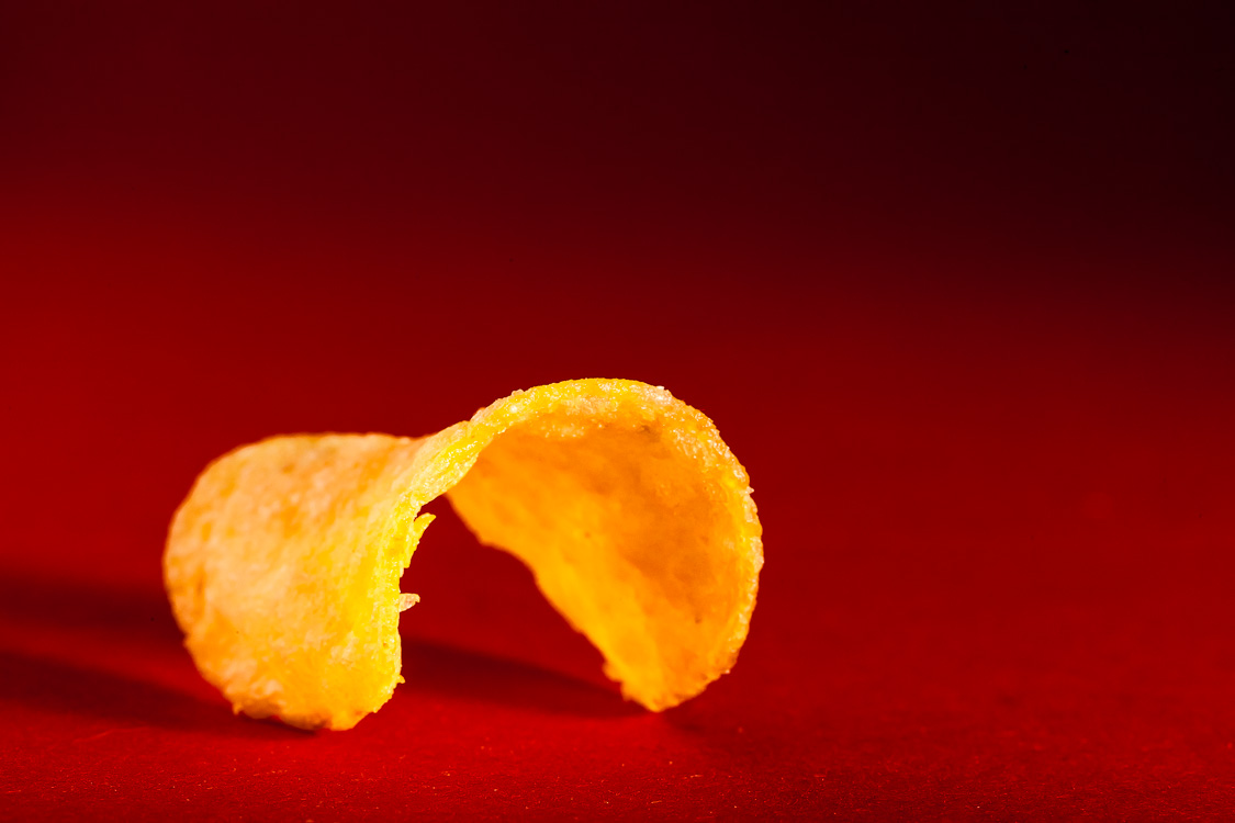 Meine Frau und ich essen ganz gern mal Chips und Käse am Abend – jedenfalls, wenn ich fürs Abendbrot zuständig bin, denn kochen kann ich nicht. Unser vornehmes Dinner heute hat mich zu einem weiteren Makrofoto inspiriert. Dazu war es nötig, dass ich ein paar Chips übrig ließ, was ja angesichts der darin eingebackenen Suchtstoffe schwierig ist. Ebenso anspruchsvoll gestaltet sich in der Regel die Suche nach einem halbwegs ästhetisch geformten Exemplar, das auch noch unbeschädigt sein muss. Jetzt, da ich den Text schreibe, überlege ich, ob ich die kleinen abstehenden Chips-Splitter an der linken Kante hätte wegretuschieren sollen – aber zu spät. Und inzwischen ist das Ding aufgegessen. Wen es nicht interessiert, wie genau man so ein Bild macht, der muss hier nicht weiterlesen. Für alle anderen kommt nun die ultimative Chipsfoto-Anleitung: