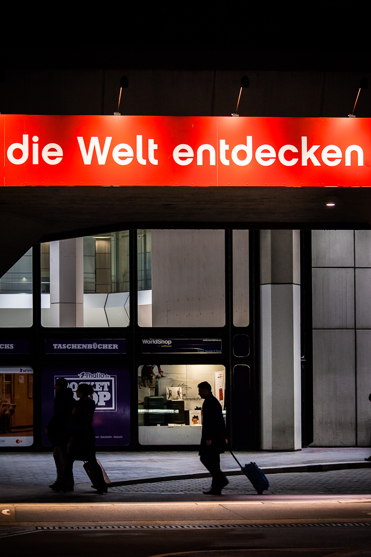 Wie gestern muss ich sagen, dass ich dieses Foto schon länger im Kopf hatte, es fehlte nur oft beim Umsteigen am Frankfurter Flughafen die Zeit, oder ich hatte für den entsprechenden Tag schon ein anderes Motiv. Jedenfalls hat es heute geklappt, ein paar zum Flugzeug laufende Reisende im Abflugbereich A unter der großen Lichtkuppel zu fotografieren. Dabei waren mir verschiedene Dinge wichtig.