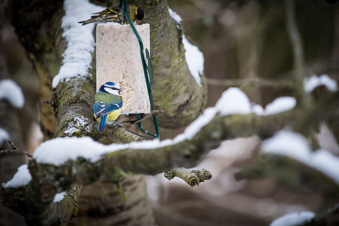 Mahlzeit, liebe Meise. Vor unserem Haus wächst ein Kirschbaum, und in dessen Geäst hängt meine Frau im Winter immer die schönsten Leckereien. Die Nicht-Zugvögel der Umgebung kommen jedenfalls gern und lassen sich, wenn man einfach nur dasteht und sich nicht groß bewegt, auch fotografieren. Allerdings komme ich in Sachen Tele-Objektiv hier deutlich an meine Grenzen. Erfahrene Vogel-Fotografen wissen: Unter 400 Millimeter geht eigentlich gar nichts, 600 Millimeter sind willkommen.